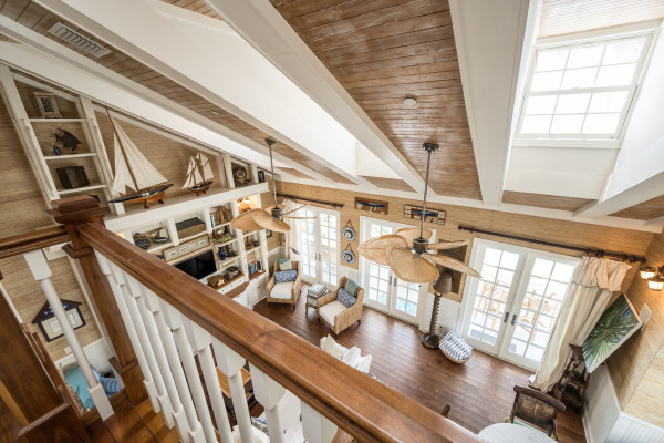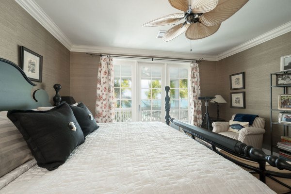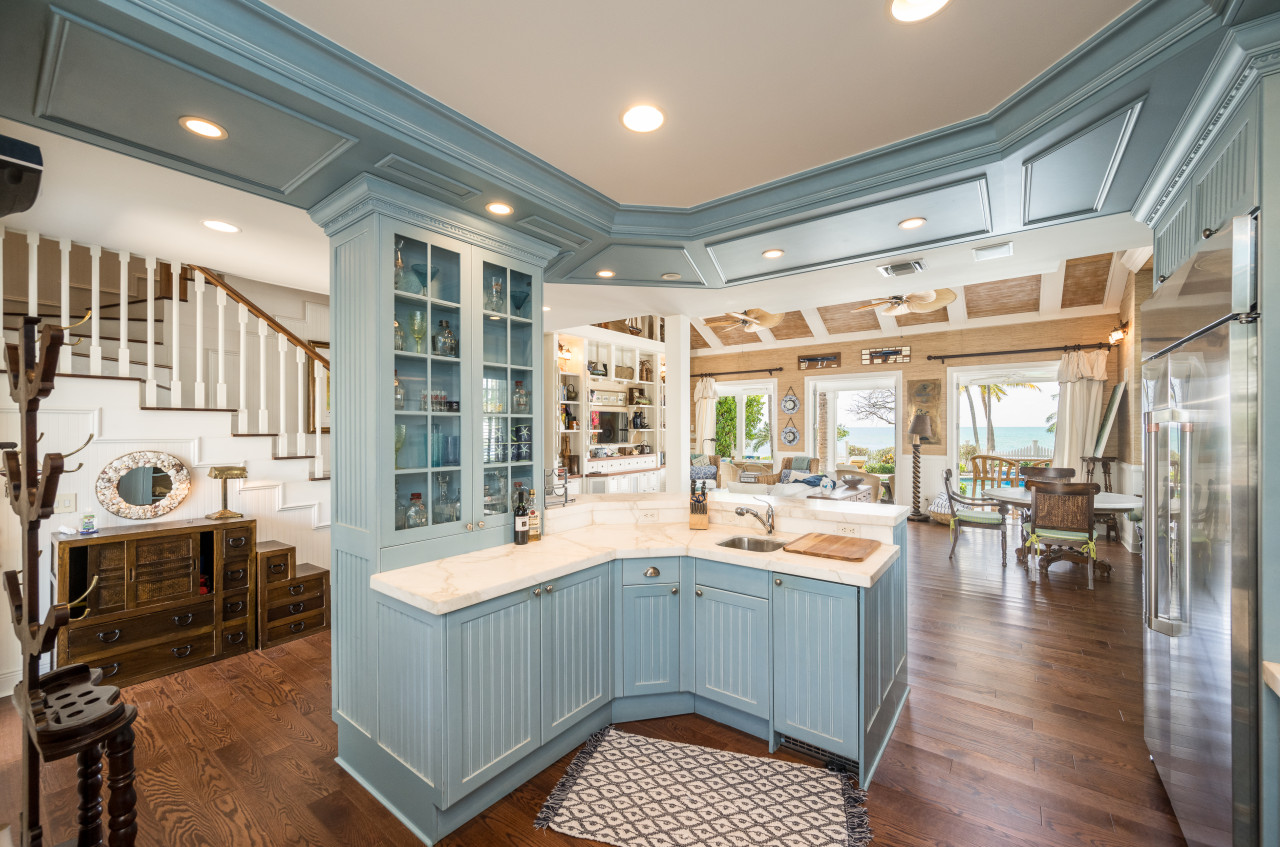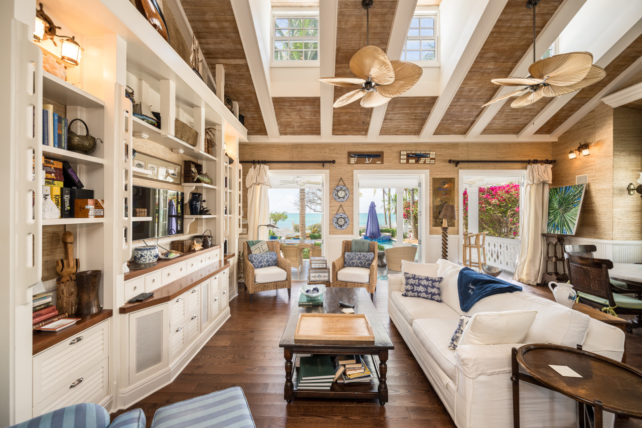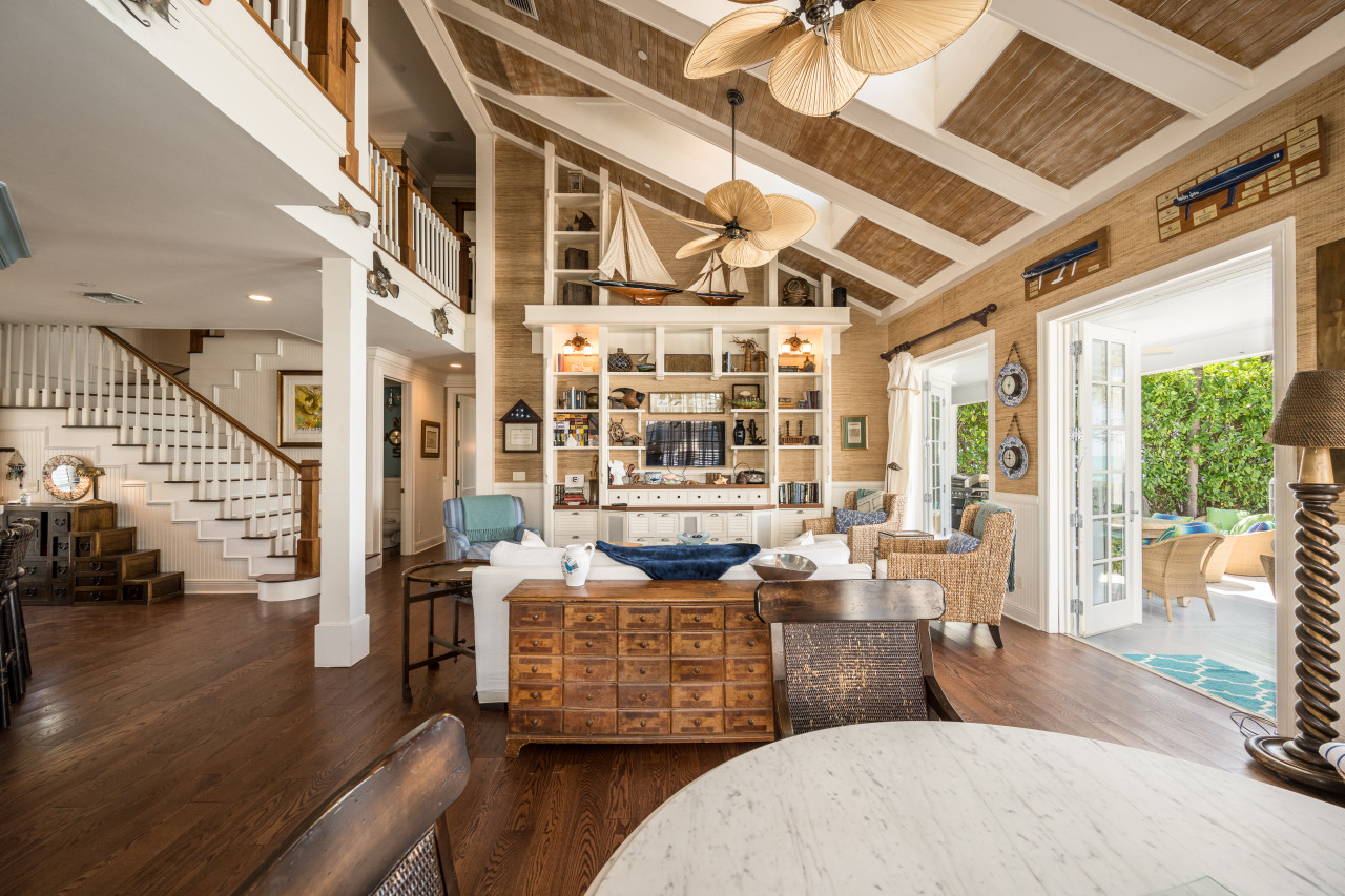 This standout property at 10 Sunset Key is the beloved island home of a world champion sailor, whose maximal nautical style immerses you in ocean life without ever leaving land. Vaulted ceilings, model helms and monohulls, coiled ropes, and other seafaring details fill the living room, which sits just off a calming blue kitchen and overlooks the pool and ocean beyond. The main level also features a spacious king bedroom with a full bathroom and direct walkout to the covered porch.
