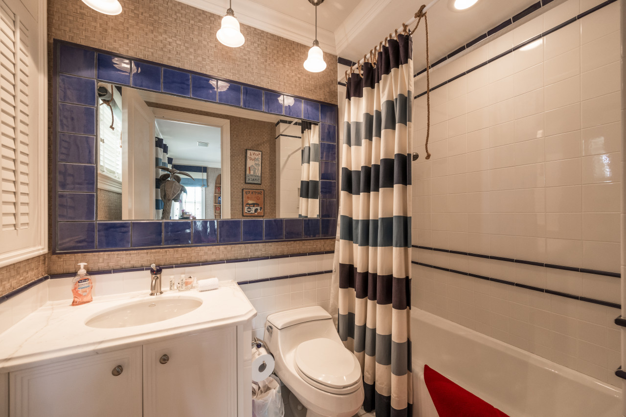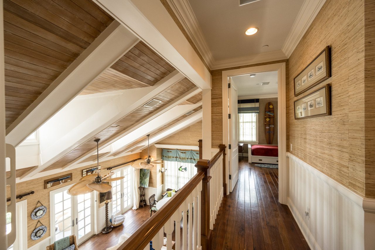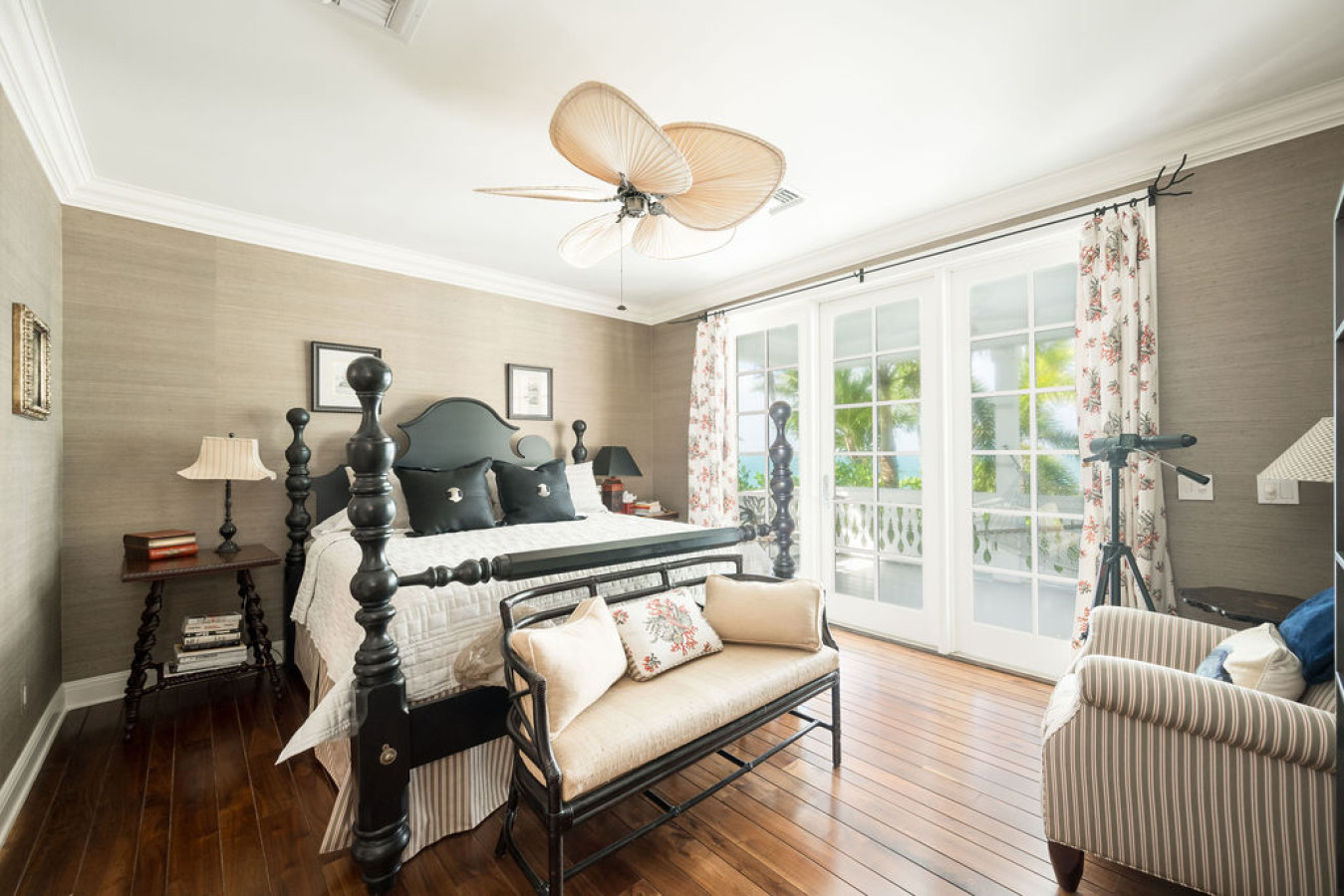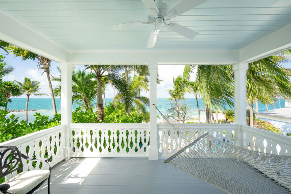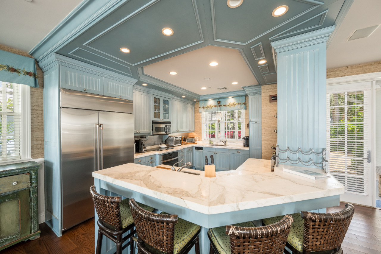 This standout property at 10 Sunset Key is the beloved island home of a world champion sailor, whose maximal nautical style immerses you in ocean life without ever leaving land. Vaulted ceilings, model helms and monohulls, coiled ropes, and other seafaring details fill the living room, which sits just off a calming blue kitchen and overlooks the pool and ocean beyond. The main level also features a spacious king bedroom with a full bathroom and direct walkout to the covered porch.