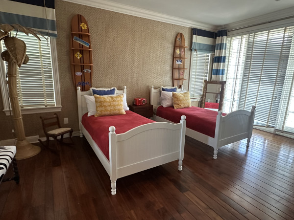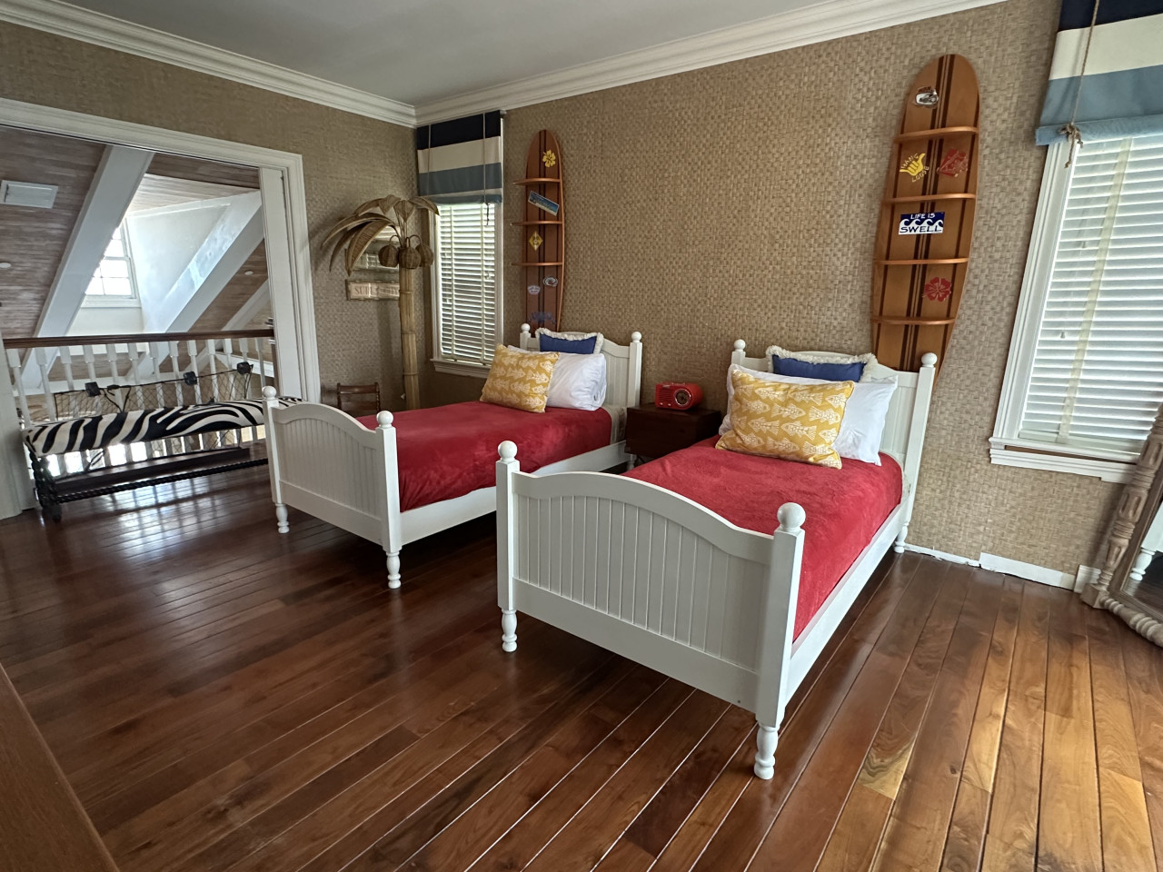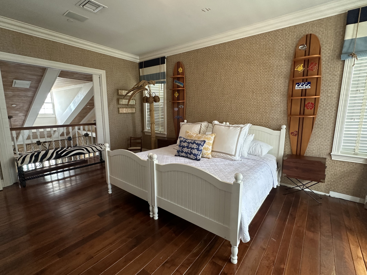Upstairs, you’ll find two additional bedrooms. One is a master suite with a king bed, full bath, and private balcony—complete with a hammock for siestas or quiet downtime. The second is a lofted bedroom overlooking the living area, furnished with two twin beds that can be converted into a king. This room also includes a full bathroom.
