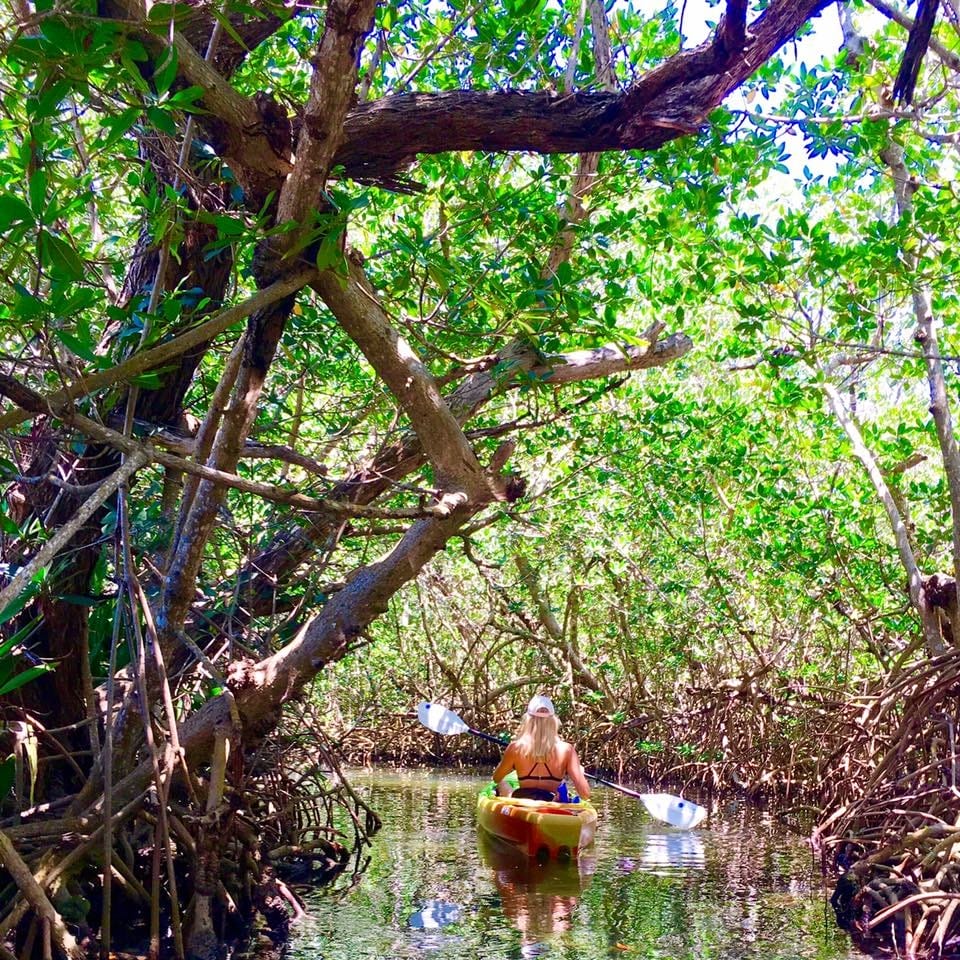A kayaker paddles through one of many mangrove tidal creeks explored on Lazy Dog’s eco-tours.
